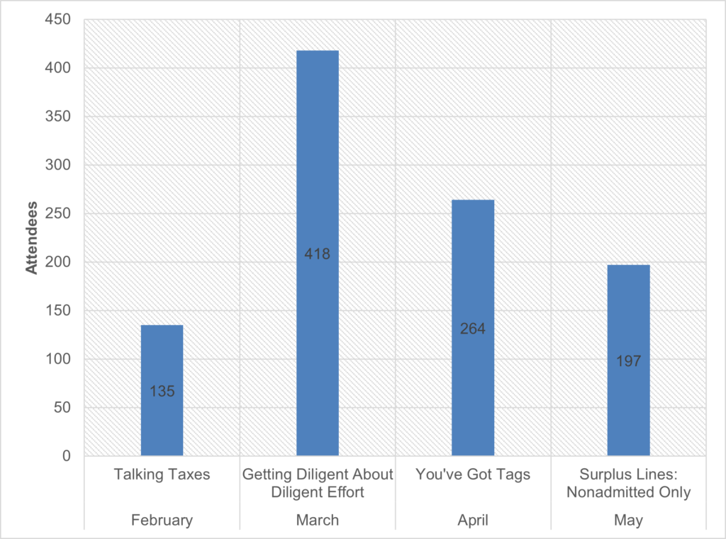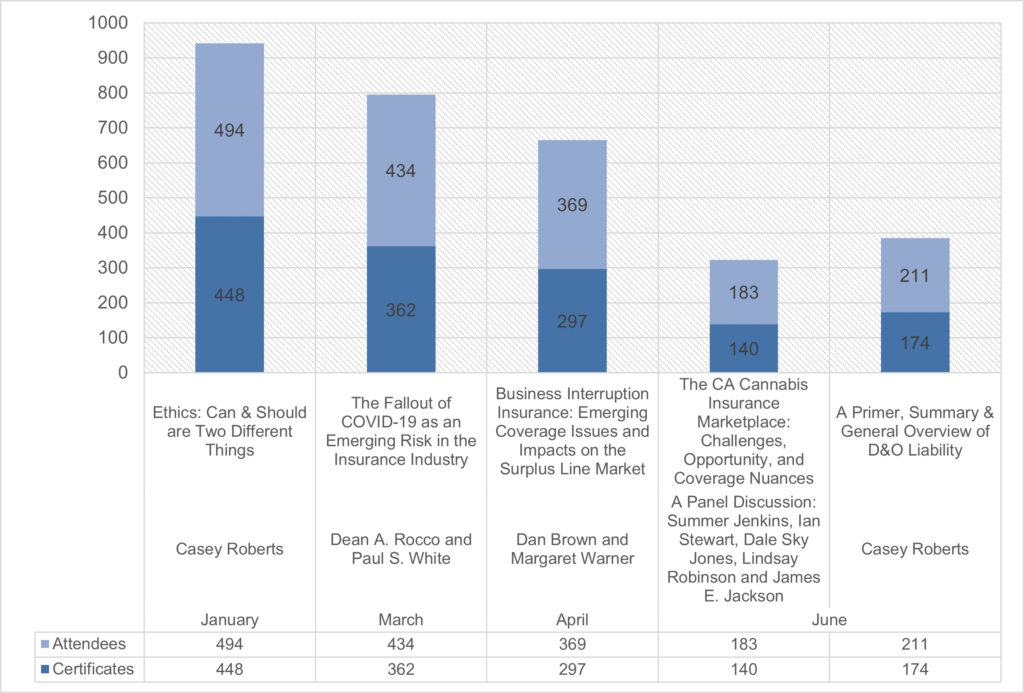 California insurance code section 1765(f) requires that all surplus line business entities provide two hours of training to its employees who solicit, negotiate or effect insurance coverage with a surplus line insurer. To date, the 2-Hour Training has been attended by over 200 members.