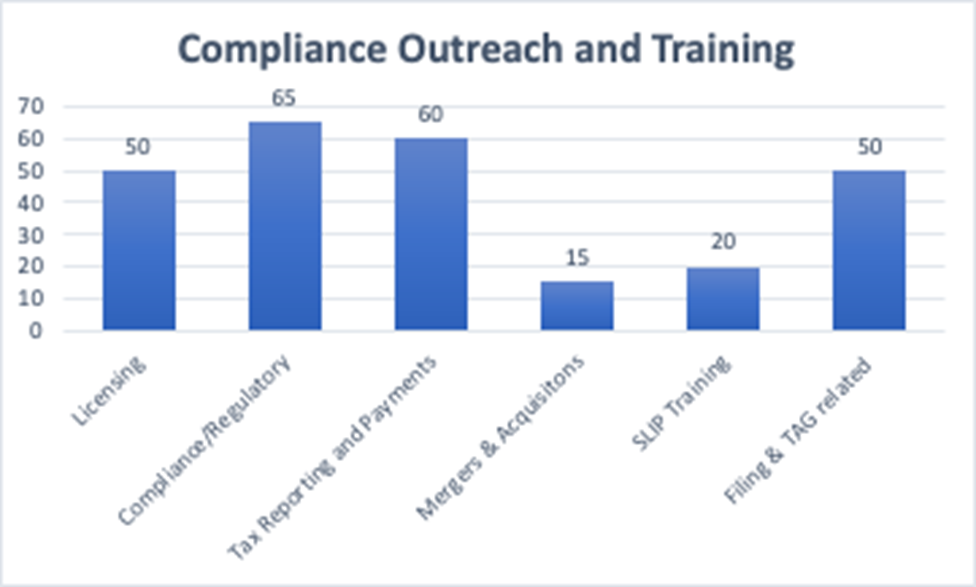Education and Compliance has focused on adding programs and services that make it easier for members to connect with the SLA and provide the information needed to submit filings in a timely and efficient manner. Our mission: 100% member compliance across all surplus line insurance filings. To date, we have reached out to over 300 individual brokers and entities to provide advice and training in various areas of compliance and filing. In the process, we have gained valuable feedback and are building partnerships that add member value. The transition to SalesForce will further increase our ability to track, identify and provide additional services that will add value for our membership. The following is a high-level overview which breaks out the compliance outreach and training efforts provided in 2022.